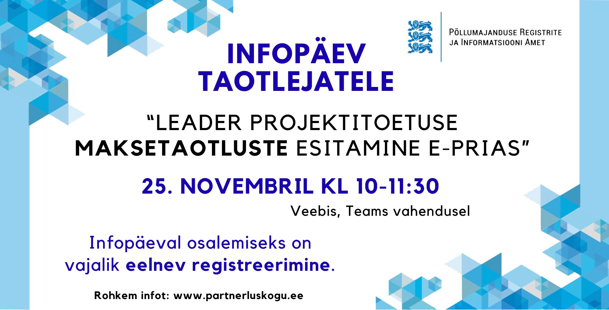Selleks, et PRIA saaks veebiseminari paremini ette valmistada, palutakse maksetaotluse esitamisega seotud küsimused saata PRIAle hiljemalt 16.11.2025. Küsimuste esitamiseks vajutage siia.